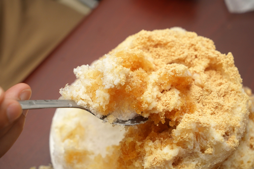 首先登場的是麵茶牛奶冰,圓鼓鼓一座小冰山,顏色也好有漸層感,麵茶、糖水和煉乳!麵茶是店家自己炒製的,吃起來有堅果香,原來是加了芝麻粉,吃完嘴裡滿是清香,味道也很清爽,比純冰更有風味,也是讓阿嬤懷念的滋味。